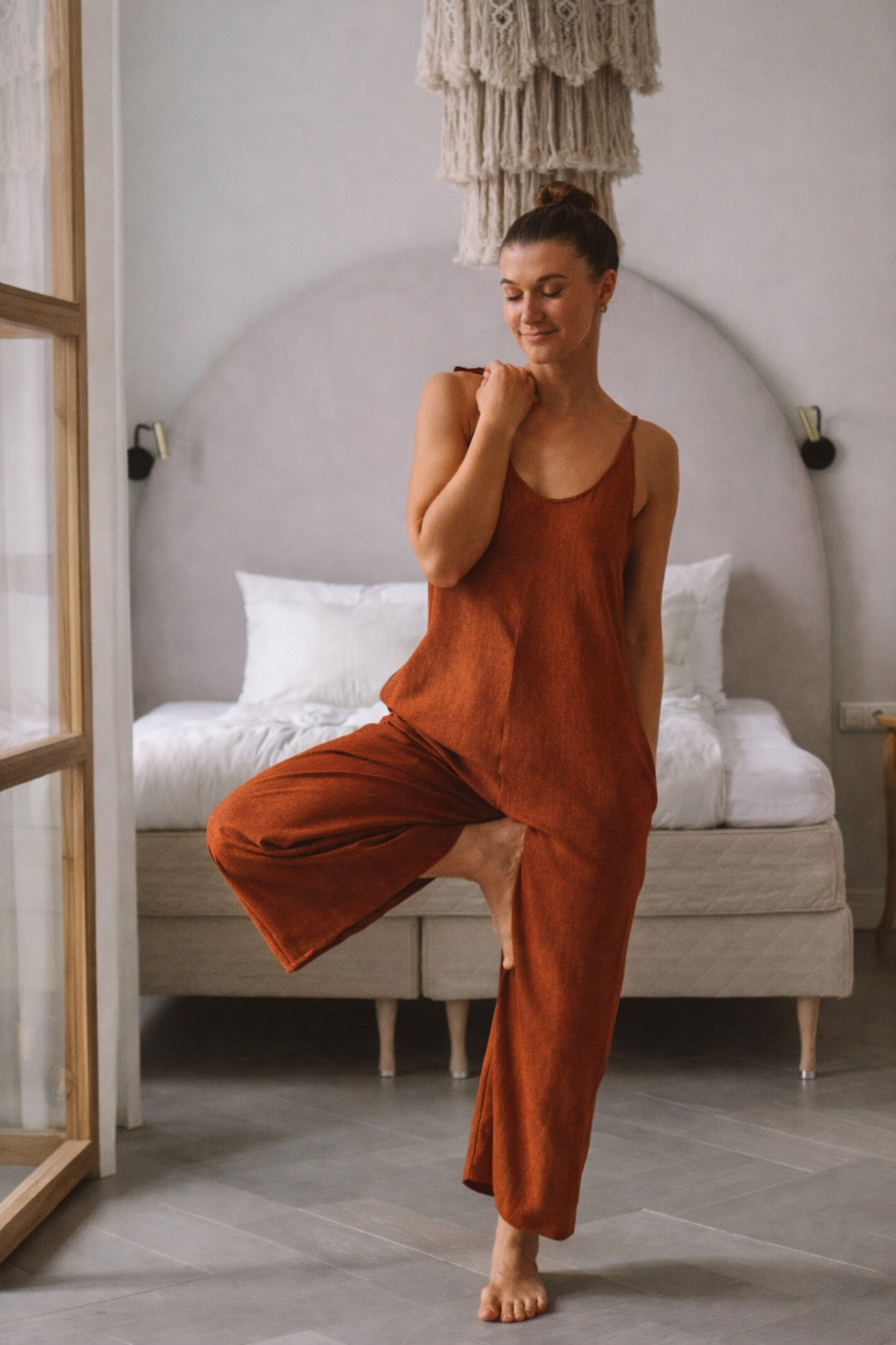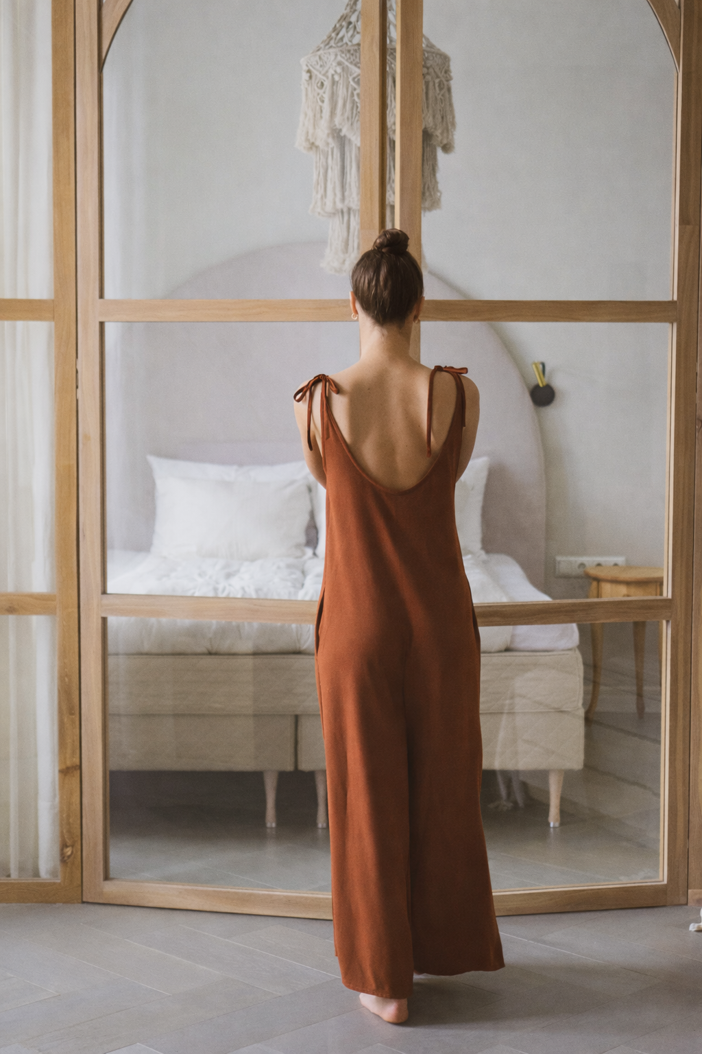Ami pükstükk on õlalt seotavate paeltega, mõnusalt vabalt selga kukkuv, taskutega ja laia sääreosaga pükstükk. Just tänu õlapaeltele saab iga naine ise pükstüki endale selga nö parajaks sättida, nii et see istuks sinu seljas just täpselt nii nagu sinule meeldib. Reguleeritav õlapael annab sulle valiku, kas pükstükk on pikk või nt pahkluuni püksiosaga, kas rinnust avaram või kinnisem, mänguruumi jagub. Pükstükk sobib kandmiseks nii pluusi peal kui nt bikiinide peal või pesuga või miks mitte ka lihtsalt niisama, et midagi all ei ole. Suviselt vaba ja mõnus riideese ilma milleta suviseid kulgemisi ette ei kujutagi. Modell on 172 cm pikk, S/M suuruse kandja ja kannab pildil S suurus pükstükki. Juhul kui soovid pükstükki pikemana või lühemana siis märgi palun oma soovitus püksi sisesääre mõõt tellimuse kommentaari.