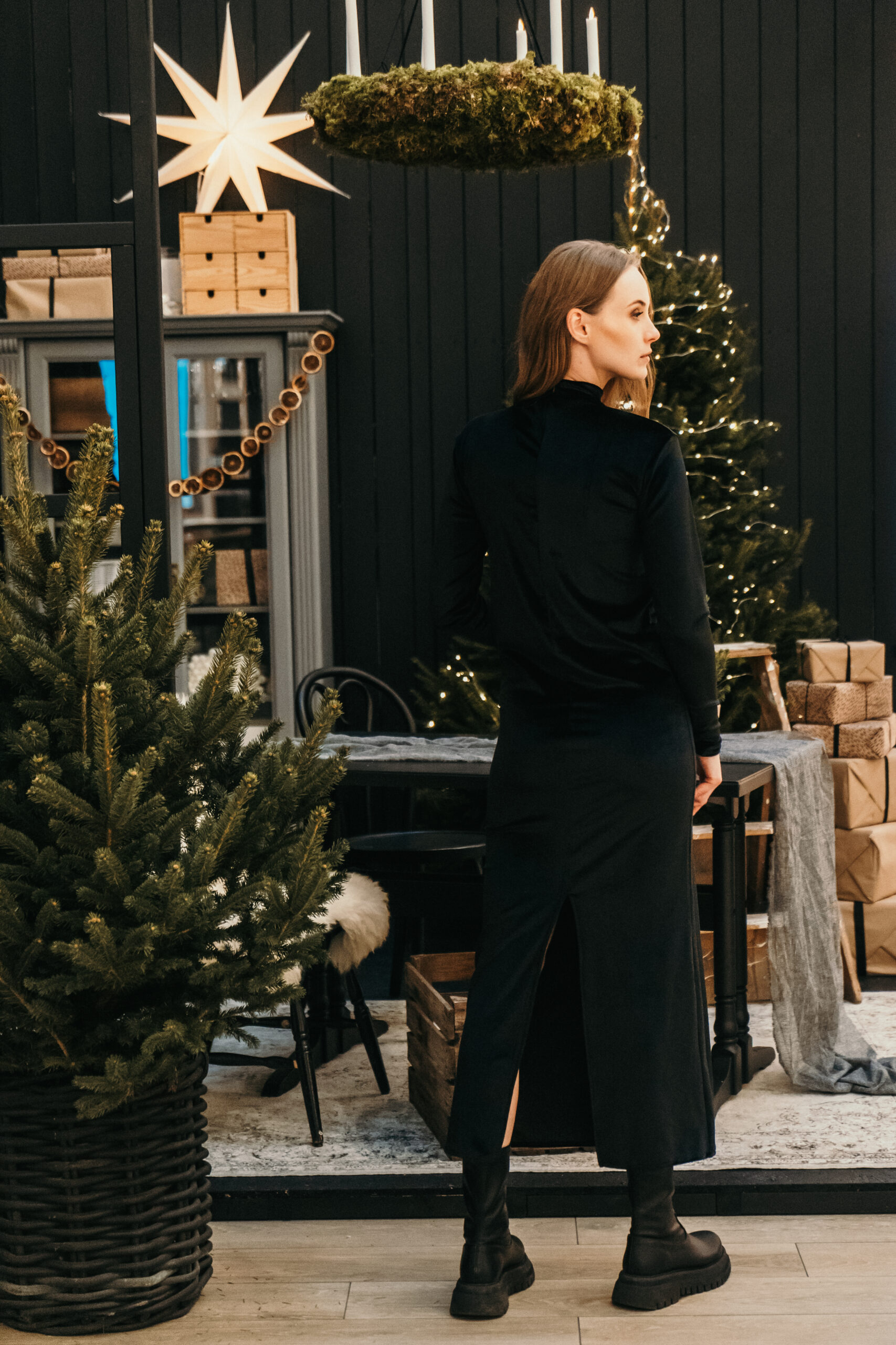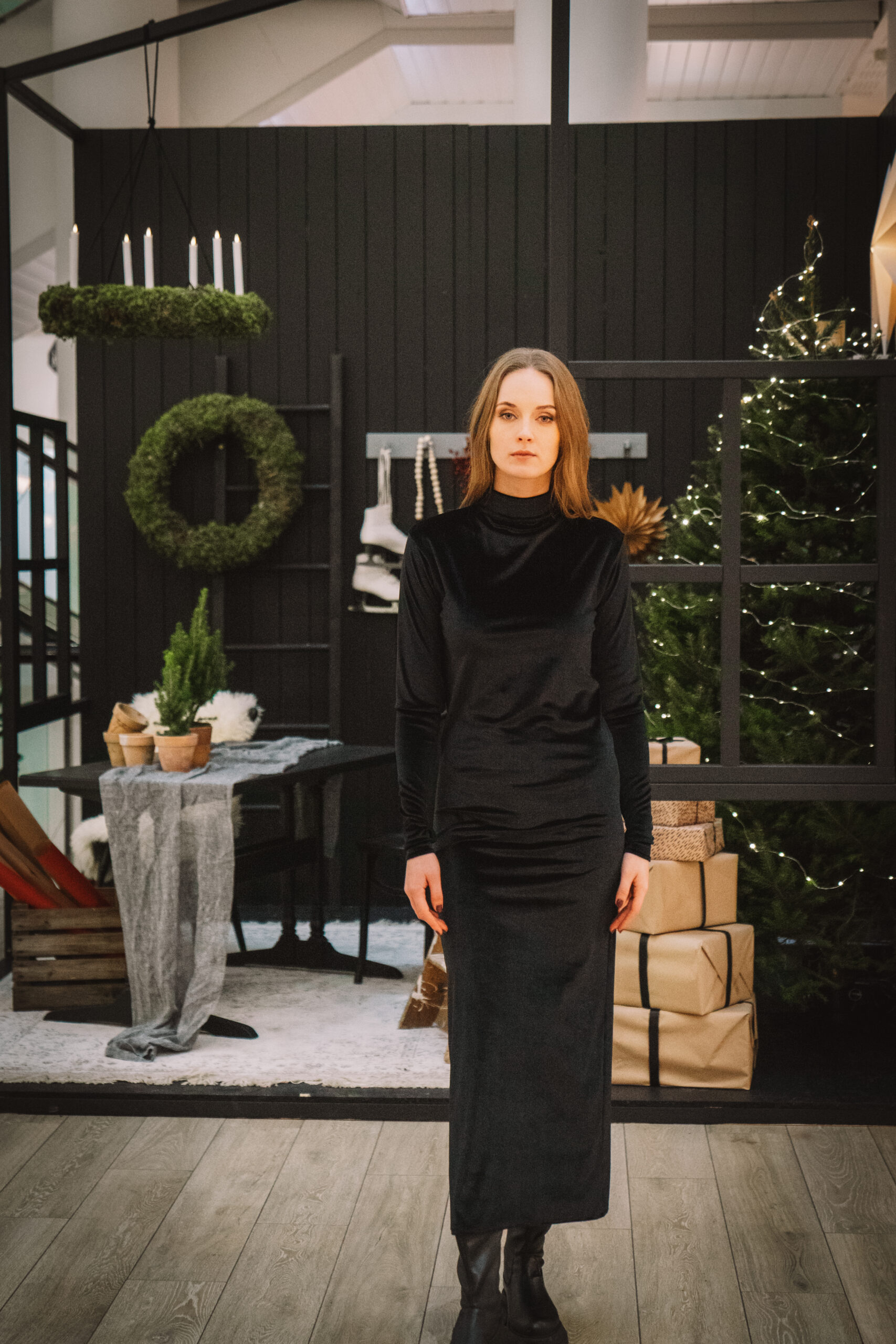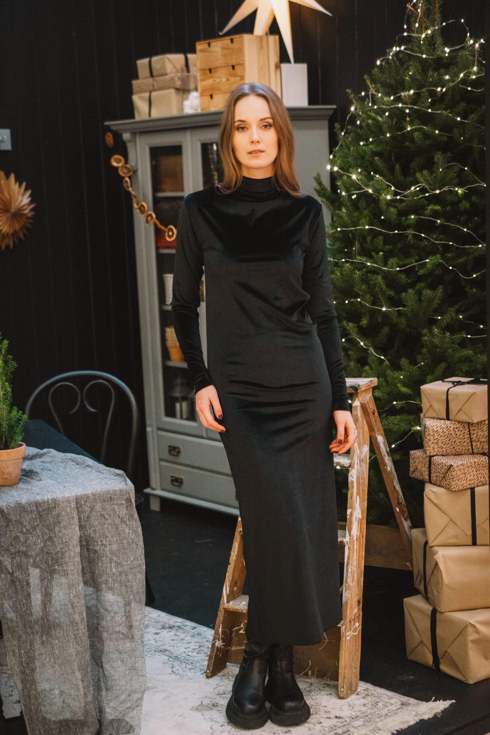 Gia on väga elegantne ja pidulik, taljet rõhutava lõikega kleit, millel veidi kõrgem kaelus ja taga avar lõhik. Kleidile lisavad iseloomu eriti pikad ja elegentsed pöidla avaga varrukad. Gia kleit on tehtud kvaliteetsest hästi langevast sametkangast, kangas ei vaja triikimist.
