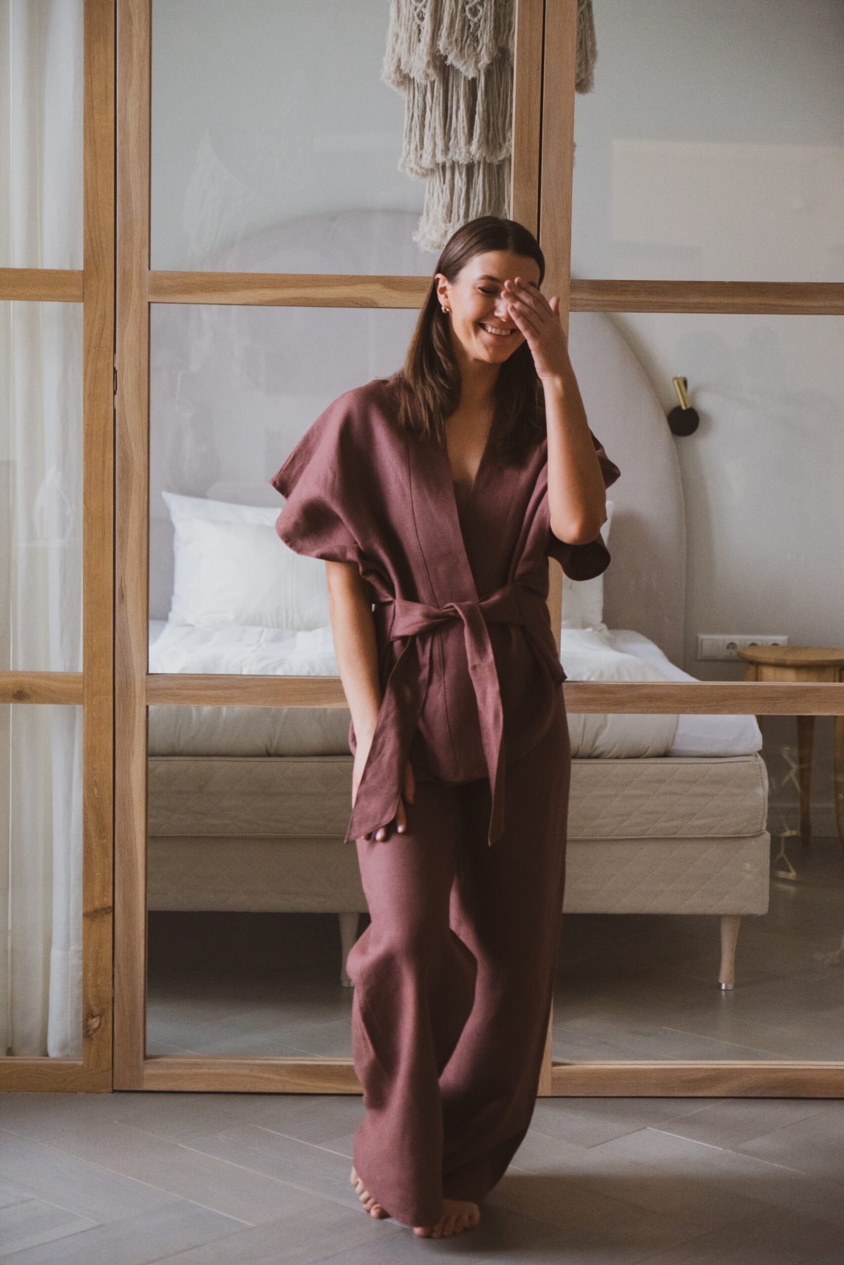Nola Saga linane kimonojakk on lühemate avarate varrukatega tagant veidi lühem, eest pikem jakk, mis tegelikult kantav ka pluusina. Jakil on vöö kinnitatud küljeõmblustesse ja külgedel on ka lõhikud. Saga jaki näol on tegemist suvisema ja lühema versiooniga meie linasest kimonojakist. Saga jakk moodustab mõnusa suvise seti koos Saga pükstega.