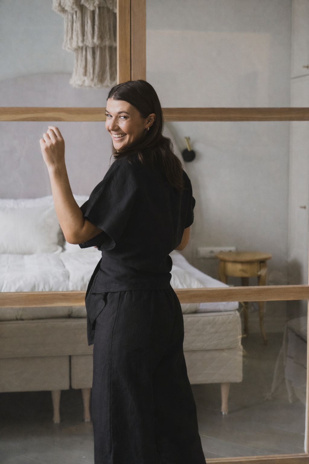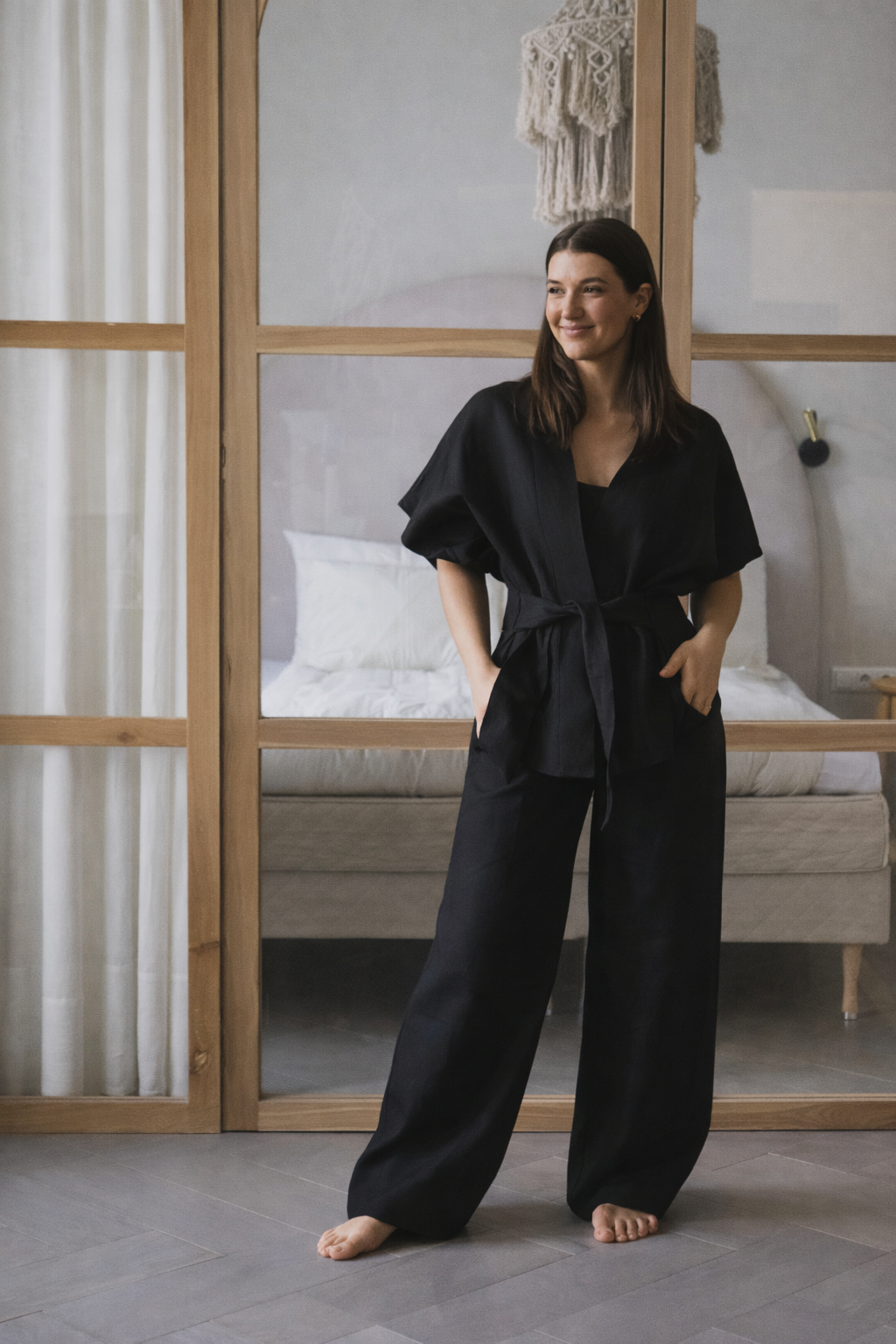 Nola Saga set on mõnus suvine komplekt mis koosneb Saga jakist ja pükstest. Saga linane kimonojakk on lühemate avarate varrukatega tagant veidi lühem, eest pikem jakk, mis tegelikult kantav ka pluusina. Jakil on vöö kinnitatud küljeõmblustesse ja külgedel on ka lõhikud. Saga jaki näol on tegemist suvisema ja lühema versiooniga meie linasest kimonojakist. Saga jakk moodustab mõnusa suvise seti koos Saga pükstega. Saga püksid on avara lõikega ülevalt pehme kummivärviliga hästi istuvad püksid. Modell on 172 cm pikk, S/M suuruse kandja ja kannab pildil S suurust loungeweari. Juhul kui soovid pükse pikemana või lühemana siis märgi palun oma soovitud püksi sisesääre mõõt tellimuse kommentaari.