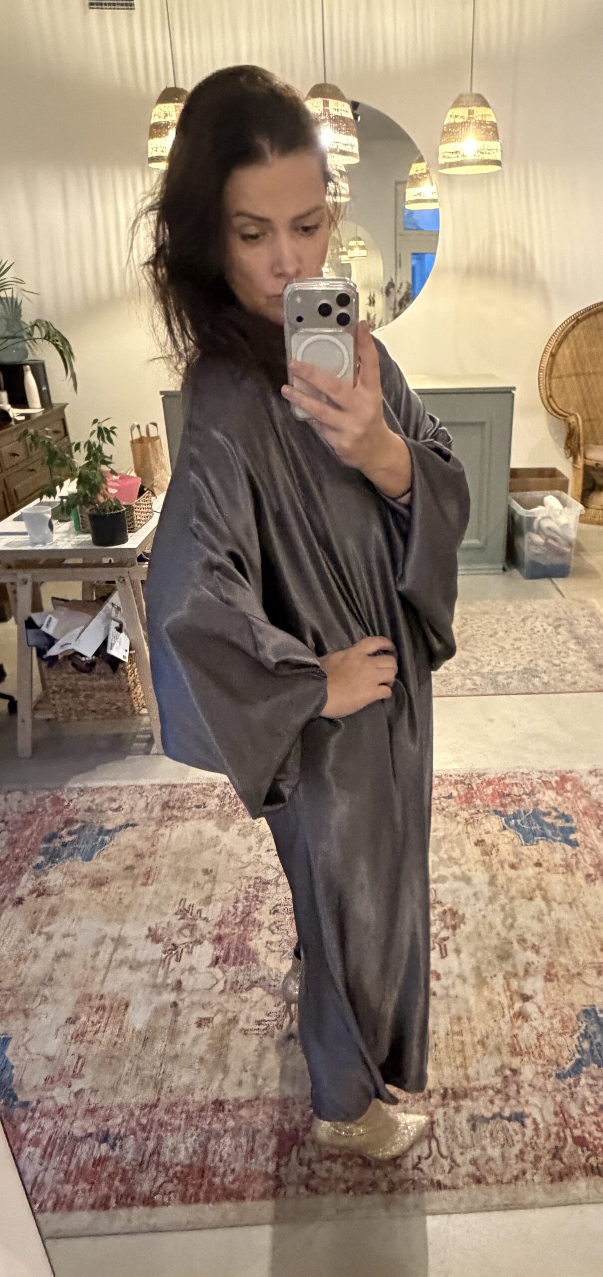 Sion on minimalistliku lõike ent suurte nö nahkhiire varrukatega kleit, millel taga avar lõhik ja üleval krae ääres nööpkinnitus. Kuna kleidi kangas on 100% viskoos, peab arvestama, et kleit vajab triikimist, nagu viskooskangale omane, jääb korts küll sisse, ent samas ripub viskooskangal kleit ennast ise jälle sirgu, olgu ta seljas või riidepuu peal. Kleiti selga pannes tõmba varruka ots kindlasti käsivarrel veidi üles, nii jääb kleit seljas just nii nagu piltidel.